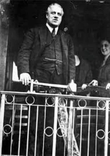 Aaron Fulch giving a speech at the opening of Bartlebees third factory. He is standing on a balcony and addressing a crowd, his hands both grip the railing and he wears his usual suit and tie, he has a semi smirk breaking through his usual grimace as he speaks.