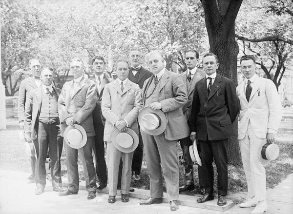 Aaron Fulch with his board of directors stand in a clearing filled with decorational trees, all hold their hats in their hands and look towards the camera with serious no nonsense expressions. All of the men wear suits and some have pocket watches on chains.