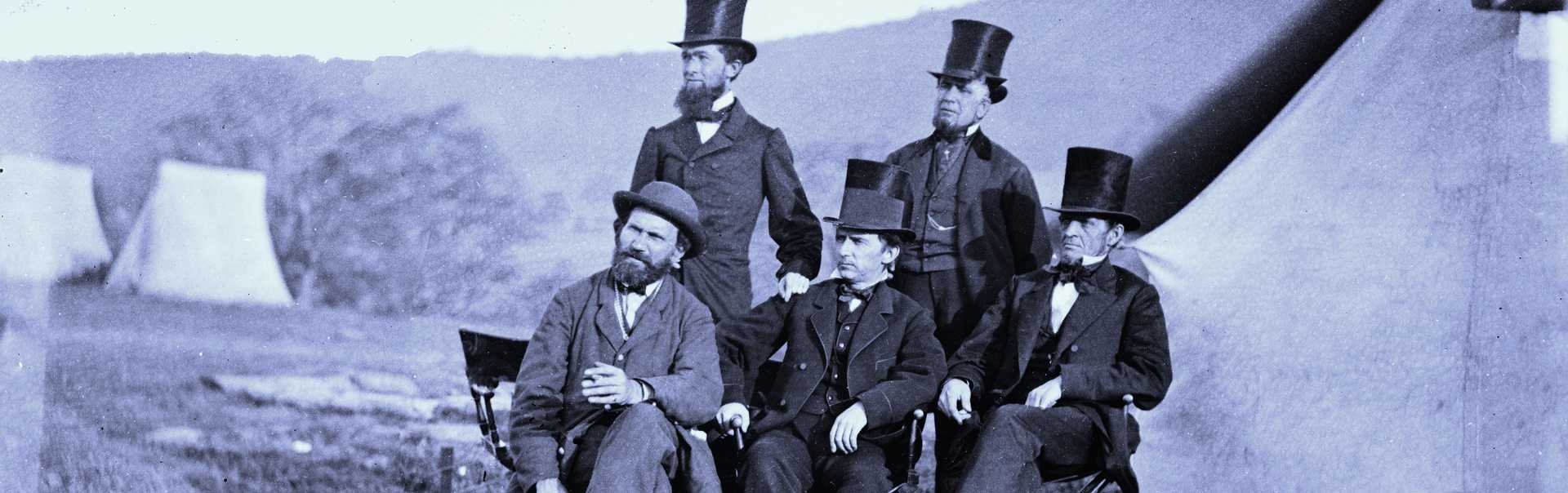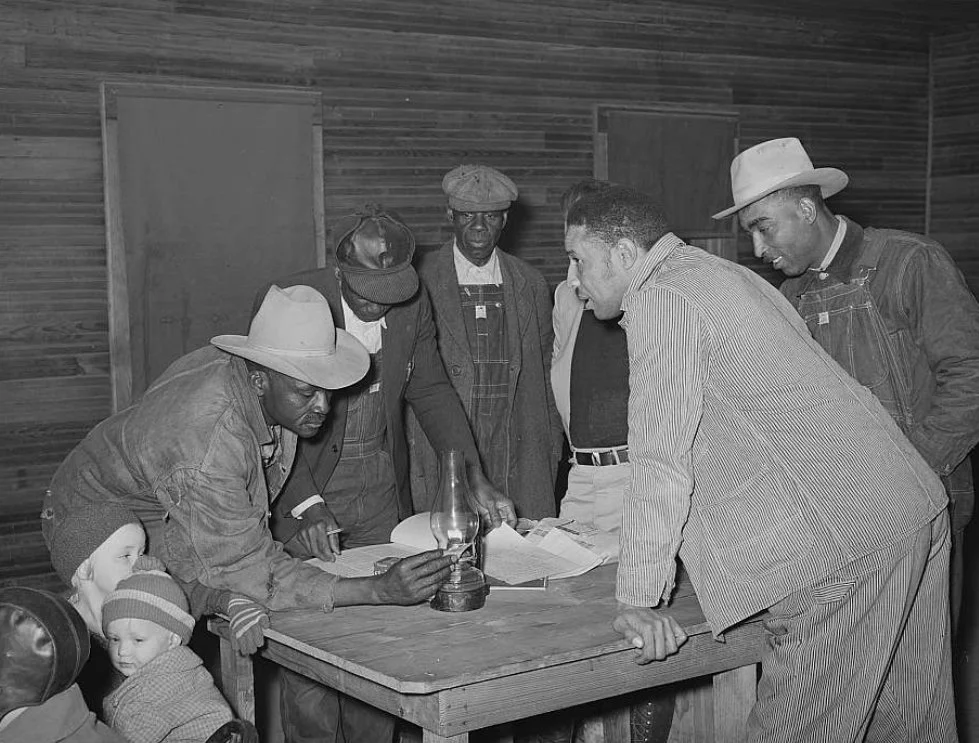 Isaiah Hoffman (far left) organizing plans with other members at one of their homes. The six union members lean over a set of papers that are sprawled across a table, all in attendance are black and wear overalls underneath coats. Some wear newsie type hats, wide brimmed hats, and Isaiah himself wears a cowboy like hat he is leaning in the most towards the table and seems to be writing on a piece of paper. Three children play amongst themselves at the edge of the adults meeting.