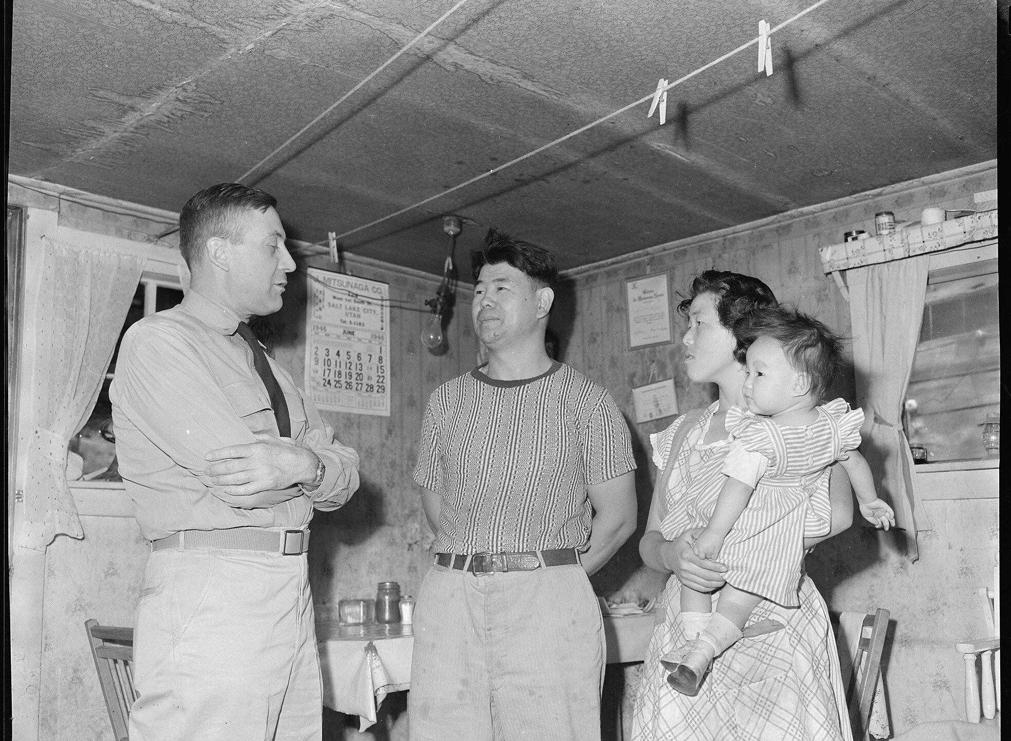 Cecil visiting the home of a fellow union member. An Asian American family talk with Cecil in their home, the room is extremely bare with only minimal decorations and laundry drying lines extending across the space. The mood is mostly casual as the group talks about events. The husband has his hands behind his back and the wife, wearing a patterned apron, holds her scruffy haired child between her arms.