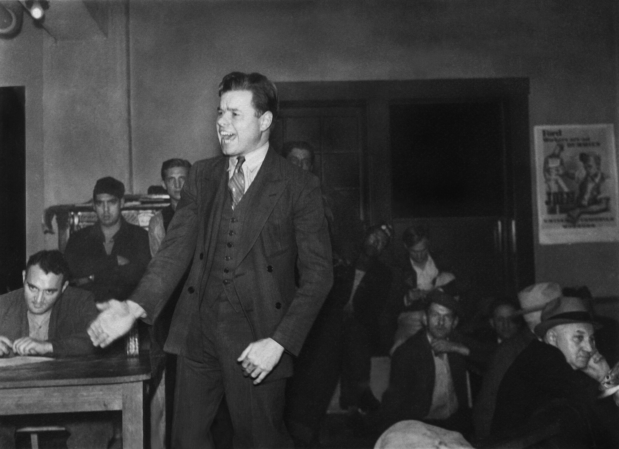 A union member (middle) exposing a Bellowton spy (far left) at a union meeting. The union member is standing in the middle of a disgruntled gathering of men in a school building. The union member furiously gestures towards the spy, a nervous shameful faced man, who cowers in his seat at one of the tables.