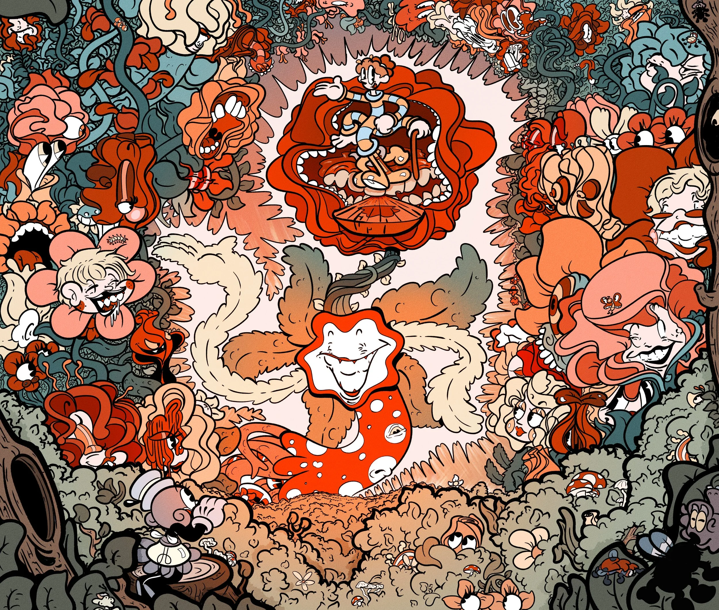 A lot of my older art focused on very intricate complex compositions! This one was actually first drawn on paper before being scanned, lined digitally, and then edited in photoshop to add those warm hues to the center of the illustration.